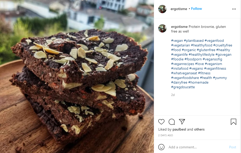 Our final pick of the week belongs to @ergotisme, presenting a tasty stack of gluten-free protein brownies. We’re loving how the background enhances the greatness of the close-up image of the brownies, the soft light of the domestic landscape below highlighting the small, yet appetizing details of this fitness snack. This is a sure feast for the eyes!
