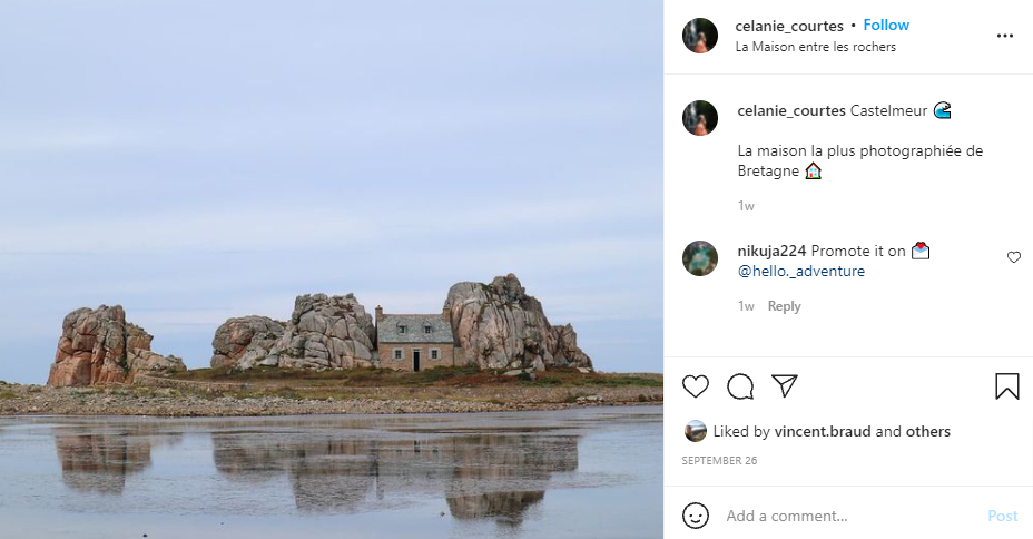 Next up is @celanie_courtes’s striking shot of Castle Meur, the house between the rocks. Here we see a man-made structure sitting perfectly well with several natural landmarks, the hue of the bricks of the house blending with the stones. The washed out coloring and the partially mirrored water really adds to that feeling of silence and serenity in this photo.