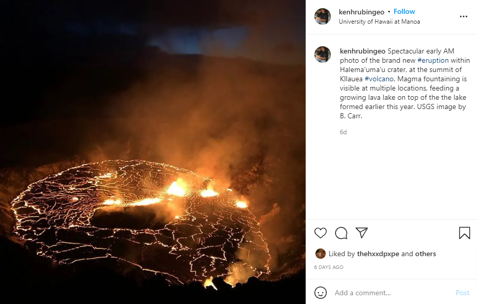 This breathtaking shot of an eruption in Kilauea is courtesy of @kenhrubingeo. The lava is absolutely stunning, the heat of the molten rock forming peculiar patterns across the dark expanse of the dusk plain. You don’t see many eruptions and lava flows up close, so images like this are quite memorable.