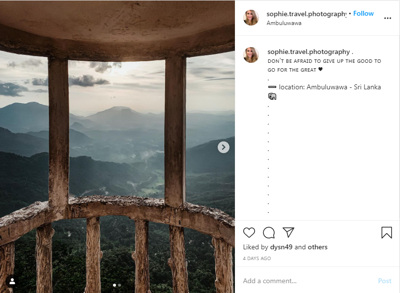 Let’s start with someplace high up in the air. @sophie.travel.photography presents this gorgeous shot from Ambuluwawa, Sri Lanka, on a balcony with wooden railings overlooking the lush landscape below. Here the distant misty mountains seemed framed by the pillars, like a secondary layer of presentation that further shows how art-like this view is. Breathing fresh air is one of the best experiences when going to such high places.